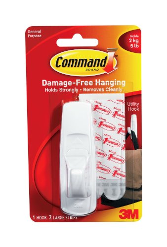 Whip your closet or workspace into shape with the Command Large Hook, a damage-free solution for hanging items in your home and office. This large utility hook holds up to 5 pounds. Thanks to the innovative Command Adhesive strips, you can mount and remount it without damaging your walls--no nails, tacks, or tape required.